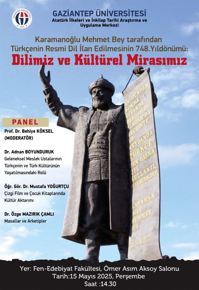 Üniversitemiz Atatürk İlkeleri ve İnkılap Tarihi Araştırma ve Uygulama Merkezi Müdürlüğü tarafından hazırlanan "Karamanoğlu Mehmet Bey tarafından Türkçenin Resmi Dil İlan Edilmesinin 748.Yıldönümü: Dilimiz ve Kültürel Mirasımız" konulu Panel